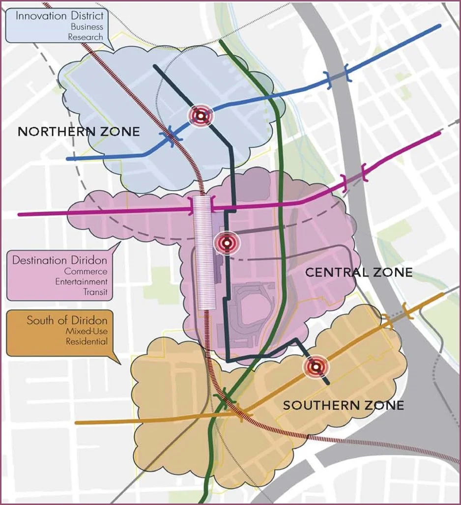 Below is a conceptual image depicting the three zones in the Diridon Station Area Plan.